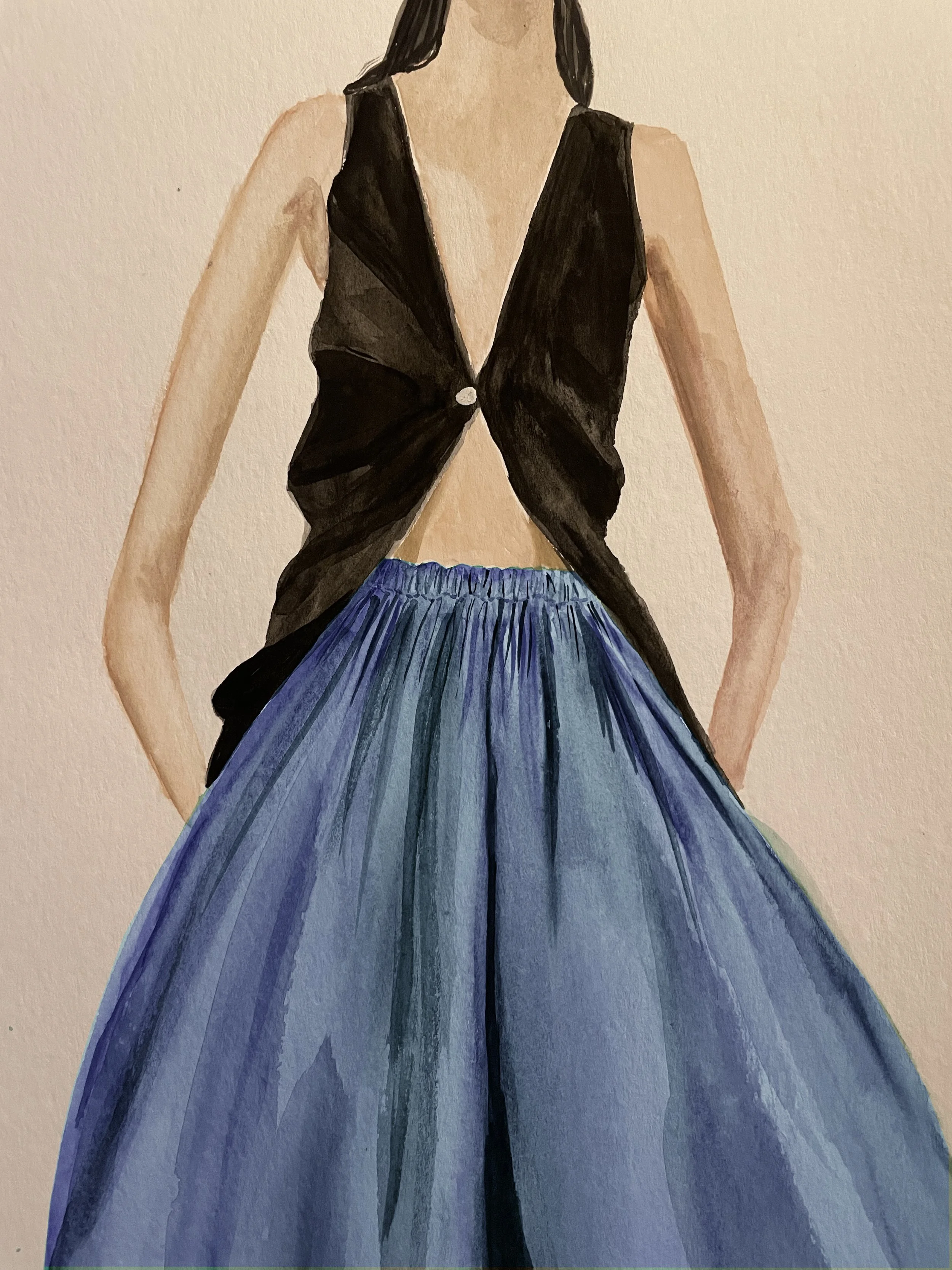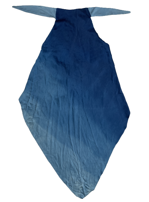 Through zero-waste patternmaking, the single silk square is turned into a halter top with hankerchief hemline, cut on the bias.